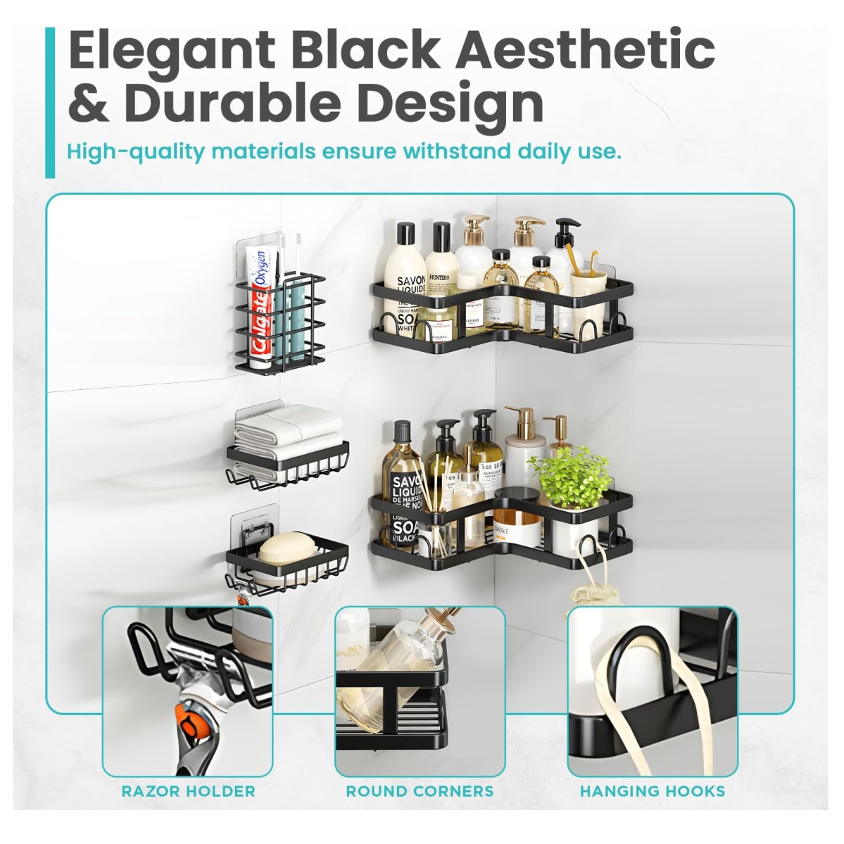 Juego Completo de 5 Piezas: Incluye dos estantes esquineros amplios para tus botellas grandes de champú, acondicionador y geles de ducha, dos jaboneras con drenaje y un práctico organizador de cepillos de dientes/rastrillos. ¡Todo lo que necesitas en un solo paquete!